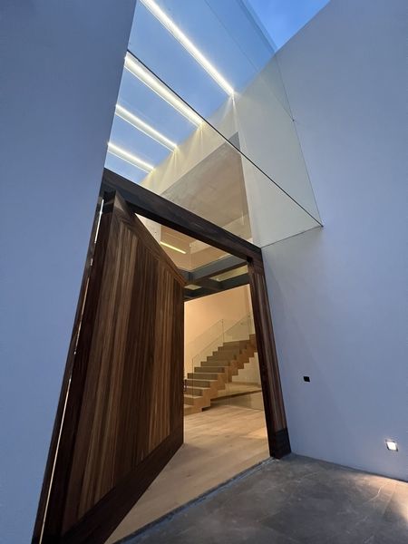 En la entrada principal de la casa te recibe un espejo de agua y una puerta de madera de roble blanco en doble altura con techos de cristal.