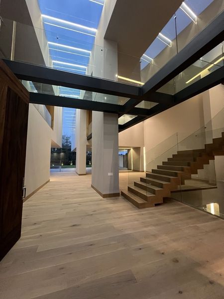 Estancia y espacios de gran tamaño y techos de doble altura, pisos de mármol Santo Tomás y cristales en ventanas de techo a piso.