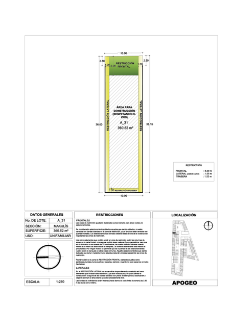 El Masterplan del desarrollo Apogeo se compone 185 lotes residenciales, ofreciendo lotes con opciones de frentes de 10.00m (106 unidades) y de 12.00m (52 unidades), así como 32 lotes de frentes irregulares. Estos lotes se distribuyen en las 4