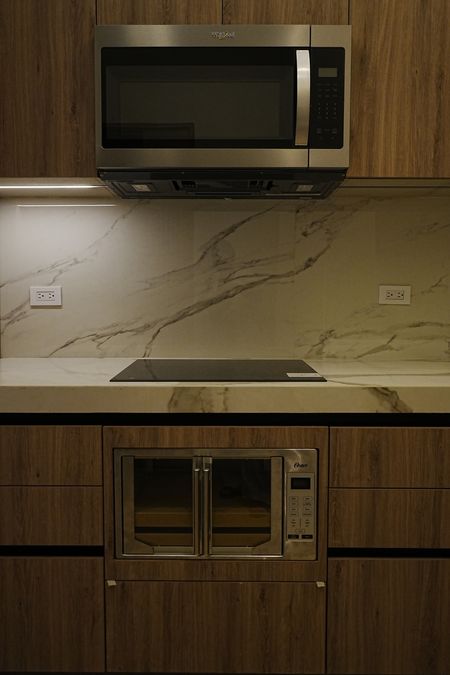 -Cocina equipada con carpintería de madera de encino, mesetas de mármol, electrodomésticos (parrilla, campana, microondas, horno de puerta francesa)