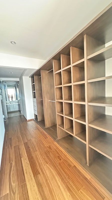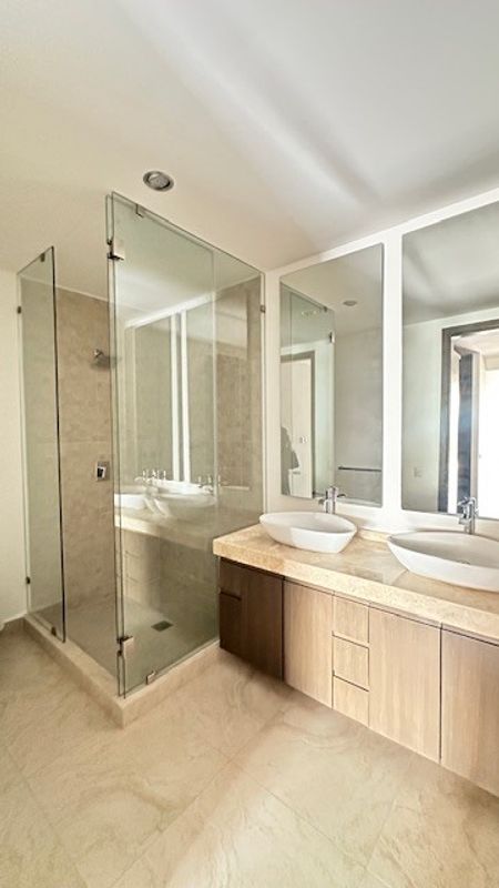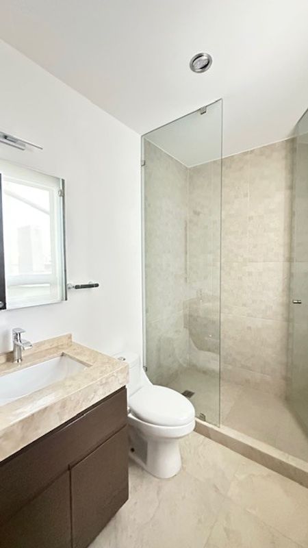 Terminados en granito en cocina y mármol en baños, pisos de porcelanato blanco en sala-comedor, y madera de ingeniería en recámaras. Bodega. Incluye persianas de sol.