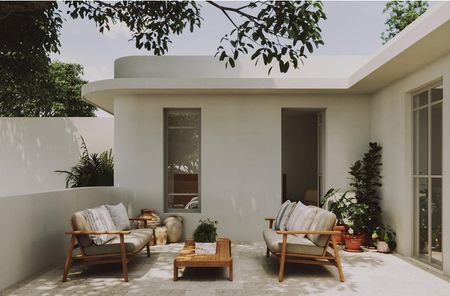 CASA 03 está distribuida en dos niveles. En la planta baja, un vestíbulo que constituye el acceso principal al conjunto, pasillo, un área de sala, comedor y cocina, que permiten la convivencia y eficiencia; una terraza techada con vista a la alberca y a la continuación de la terraza, descubierta. Las recámaras y baños se diseñaron pensando en la intimidad y el descanso (una recámara se encuentra en la planta baja, y la otra, en el segundo nivel). AMENIDADES CASA 03: cocina equipada, mesetas de silestone, carpintería en madera de cedro, cancelarías de herrería, closets completos, acabados interiores con piso de pasta y cemento pulidos, acabados exteriores de piso con piedra volcánica, electrodomésticos, tanque de gas estacionario, ventiladores industriales, preparaciones para aire acondicionado, interfón, preparación para instalaciones de internet, estacionamiento techado para un auto; en el condominio: tanque de presión de agua, sistema de suavización de agua, local de desechos, bodega, transformador.