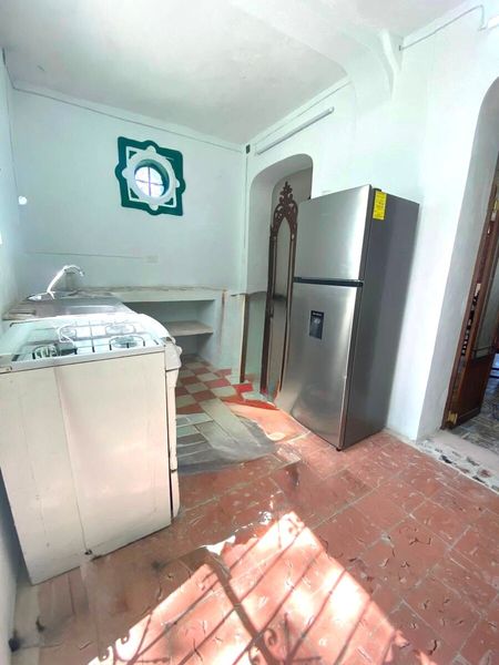 -Cocina con estufa, refrigerador, tarja y entrepaños de losa
