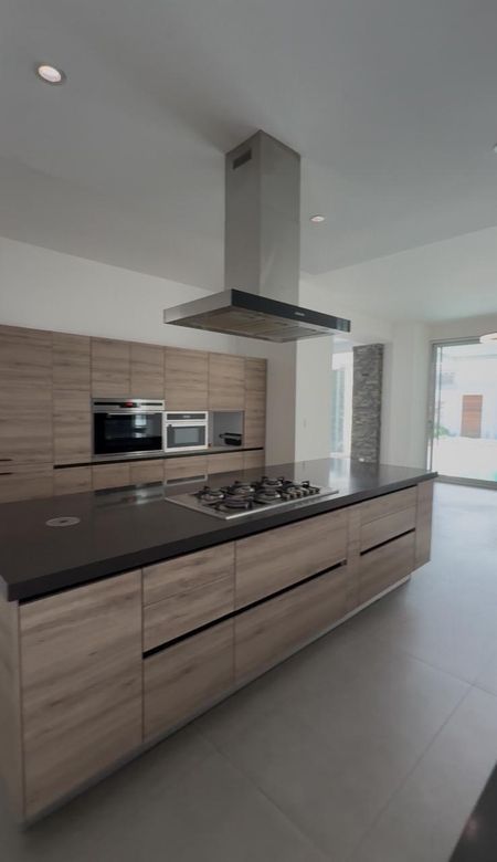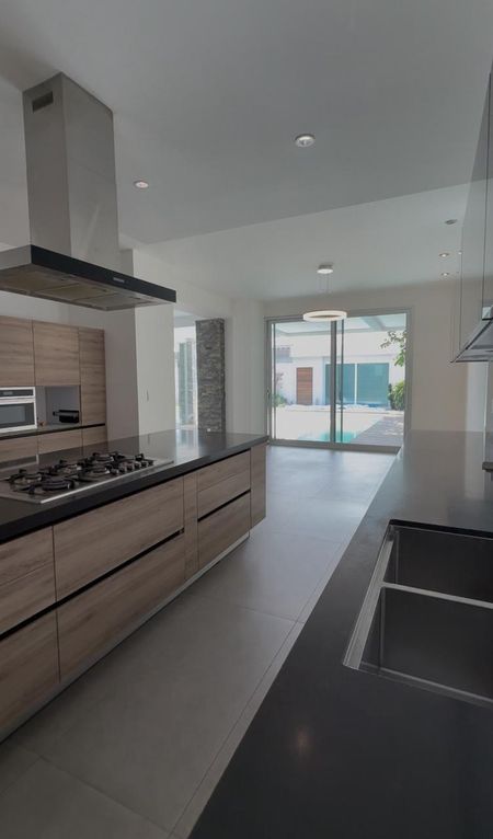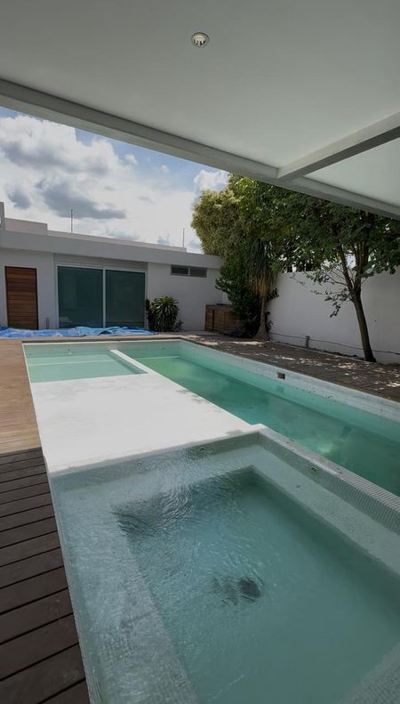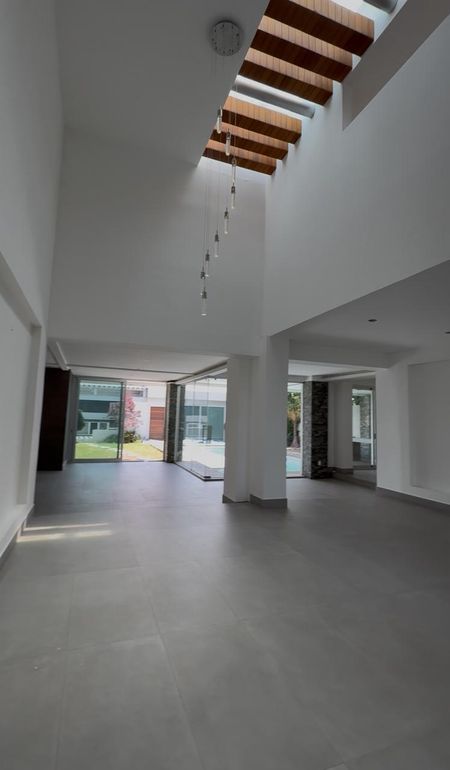 Comedor y área de bar, medio baño de visitas, estudio, cocina súper equipada con área para antecomedor, alacena, recámara y baño de servicio y área de lavado. Gran jardín con alberca, área de asador con terraza techada, cuarto exterior de visitas con baño completo.