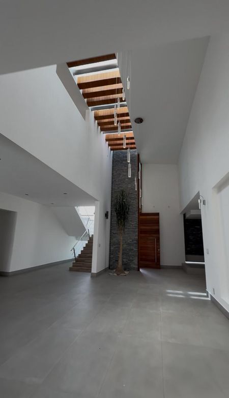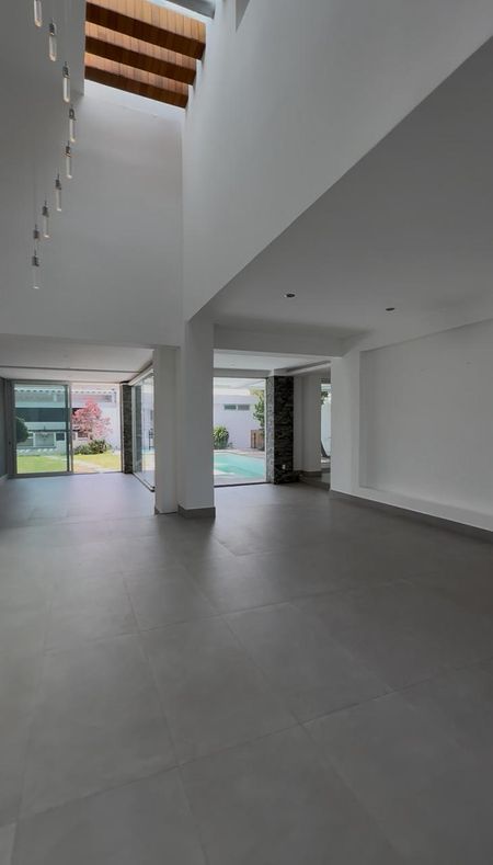 En primera planta encontramos cochera para 4 autos y bodegas exteriores, hall de acceso a doble altura, sala