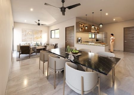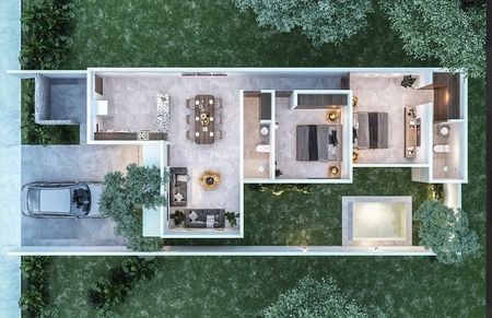 Características : Una sola planta , área sala-comedor , cocina amplia , medio baño , recámara principal con clóset Walking , baño completo , recámara secundaria con clóset y baño completo, ambas recámaras tiene acceso al área de alberca , garaje para 2 autos , área de lavado techada .