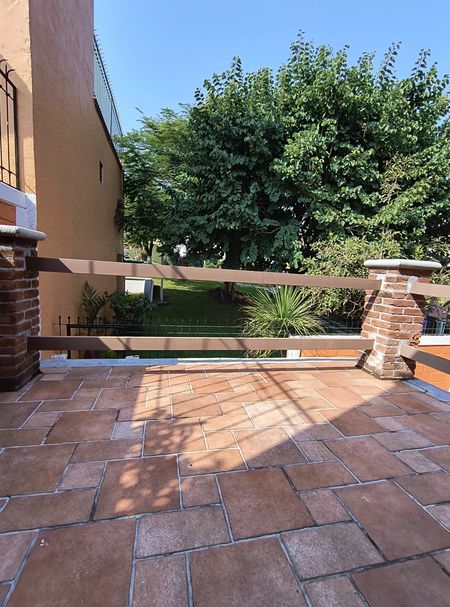 Parte trasera con cuarto de lavado y patio con terraza y vista al área común.