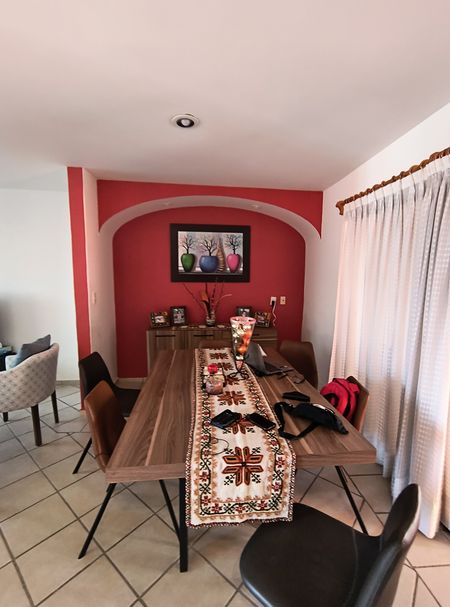 Estancia comedor en una sola área abierta. Frente con dos estacionamientos y posibilidad de un tercer auto.