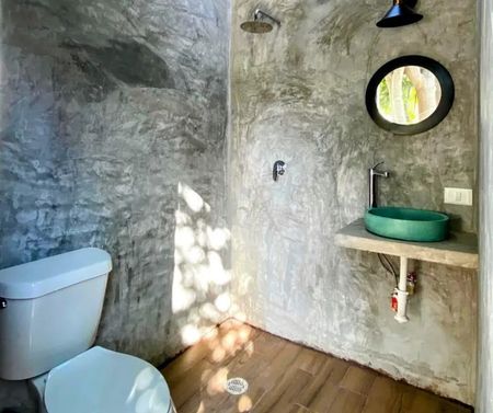 Recamara secundaria con baño completo, closet, vista a la piscina, aire acondicionado y ventilador.