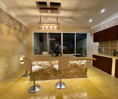 Cocina y comedor juntos con vista a la piscina, isla amplia con estufa eléctrica, gavetas de madera, acabado con Chukum, piso de pasta y aire acondicionado.
