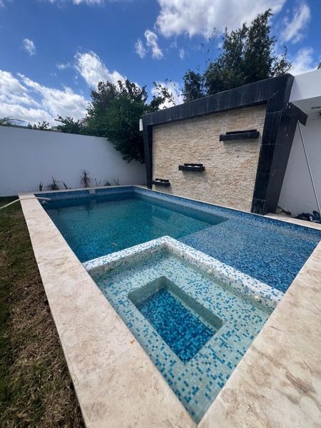 Alberca de 5 x 2.50 con acabados venecianos y mármol , también tiene nivel de poca profundidad de uso infantil de 2metros y medio x 2 metros y Medio