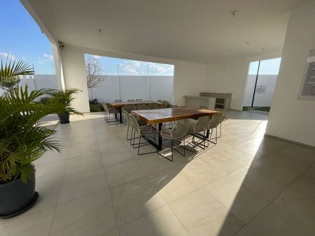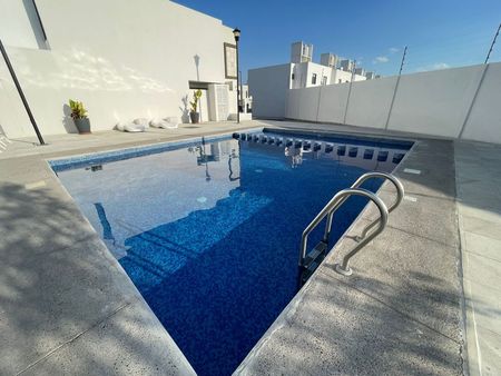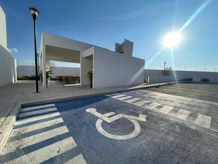 Dentro del fraccionamiento hay alberca, terraza con mesas para eventos, baños comunes, lugares de visita y acceso estrictamente controlado (sin QR no se da acceso).