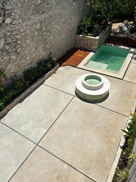 -Terraza exterior con aljibe original convertido en banca decorativa.