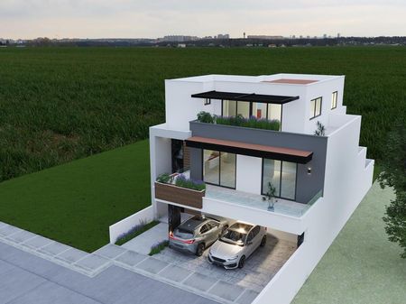Planta alta: recámara secundaria con clóset y baño completo, recámara principal con vestidor, baño privado y balcón, sala de TV y una terraza al frente que realza la fachada.
