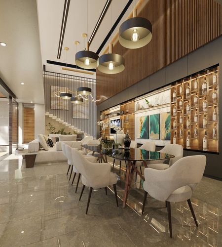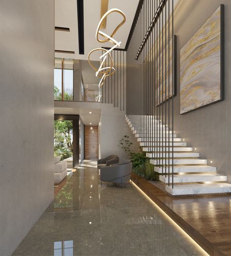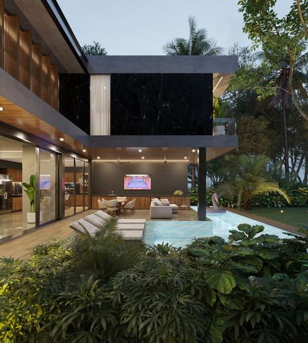 Piso de mármol monterrey, fachada en aluminio color madera, cancelería de aluminio con cristales de 6mm, cristales templados de 10 mm en escalera y baños, mesetas de granito o mármol en baños, cuarzo o granito en cocina, deck de cumarú en piscina.