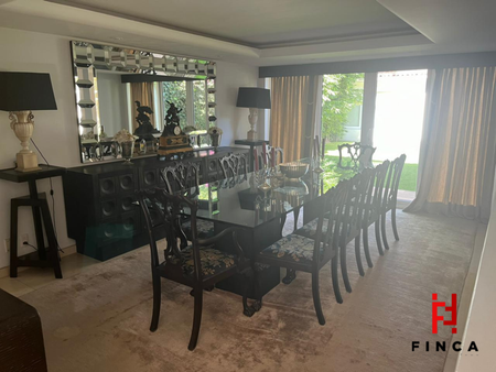 Planta baja: recibidor muy grande, una oficina, sala y comedor con vista y salida al jardín, cocina cerrada con desayunador, también con salida al jardín, baño de visitas, un salón de fiestas también justo en frente de sala y comedor cruzando el jardín con cocina y baño. Área de lavado y cuarto de servicio con baño.