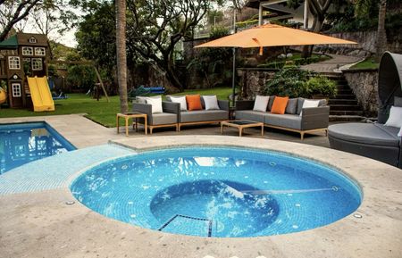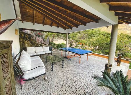 4 baños completo, medio baño de visitas, sala, comedor interior, cocina integral equipada, comedor grande en terraza, alberca, cancha de padel, mesa de ping pong, espacio para hacer fogatas,