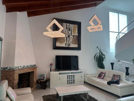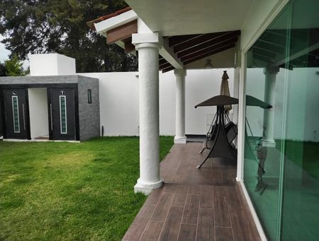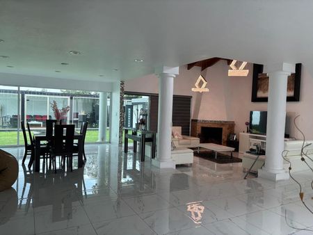 Recibidor abierto, Despacho con puerta francesa de cristal reticulado, baño de visitas, 1/2 baño de visitas, closet de visitas. Sala espaciosa de doble altura con techo envigado. Preciosa chimenea de cantera. salida al porche para contemplar su jardín