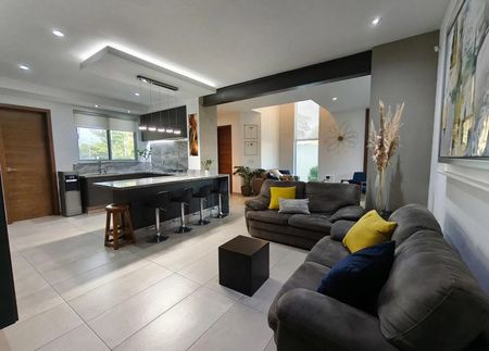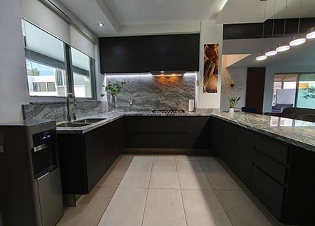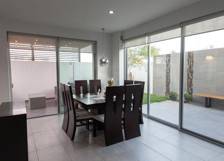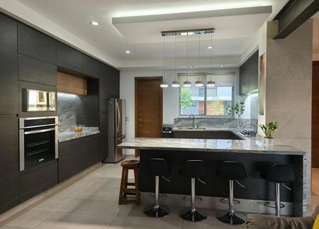 Planta baja: Cochera para 3 autos, recibidor, sala doble altura, comedor, ante-comedor/family room, amplia cocina con granito, barra desayunadora y alacena, baño completo, área de lavado, jardín con terraza y asador.