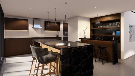 Cocina con isla y alacena, cava o bar doble tarja con mono-mando, horno, parrilla, campana, preparación para lava vajillas, iluminación LED,