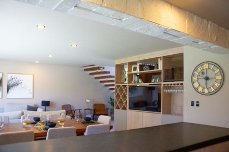 Planta baja: garage techado para 3 vehículos, baño de visitas, sala, sala TV, comedor, cocina equipada, cuarto de servicio con baño, acceso de servicio, jardín, terraza.
