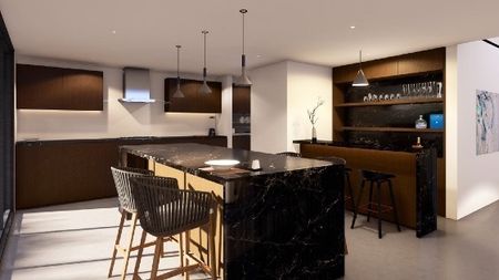 Cocina equipada con isla, parrilla, campana, alacena y acabados premium
