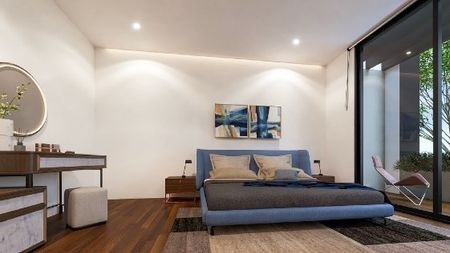 Recámara principal con balcón privado, amplio vestidor y baño completo