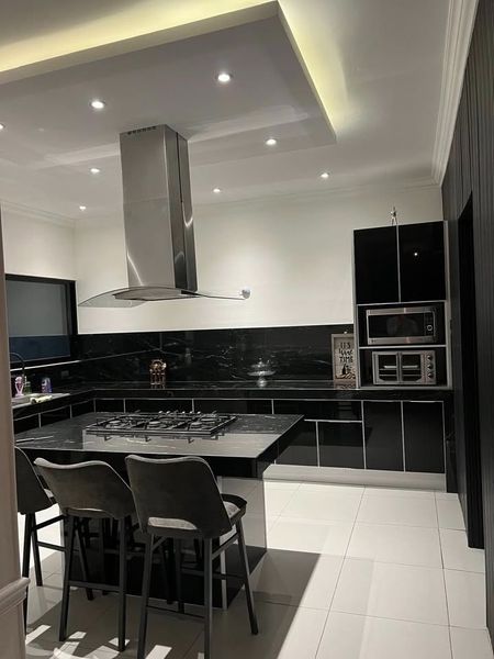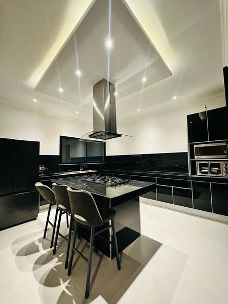 Cocina marca Luova con interiores de aluminio y puertas de cristal templado en color negro mate con garantía de 25 años