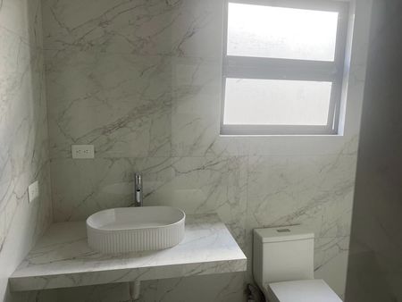 Medio baño de visitas con base de lavabo en mármol