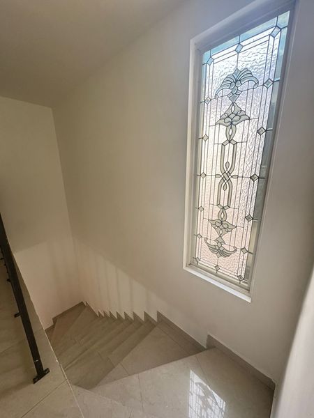 Vitrales decorativos y candiles de cristal cortado que añaden elegancia y luz natural