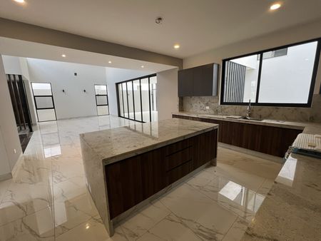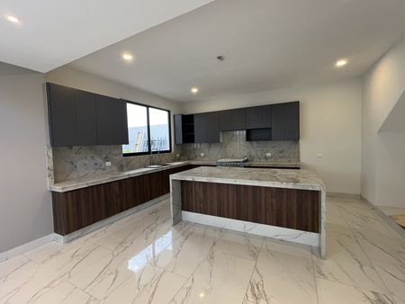 - Cocina integral con tarja de acero inoxidable y mezcladora cuello de ganso, gaveteros en Isleta Central, bajo cubiertas y sobre barras principales, campana, horno y parrilla de gas.