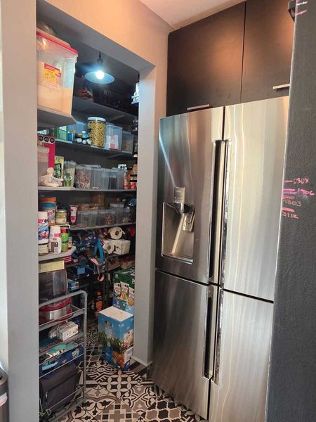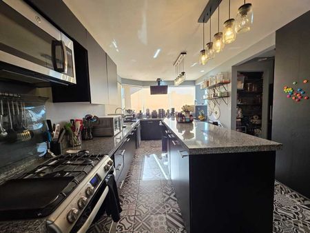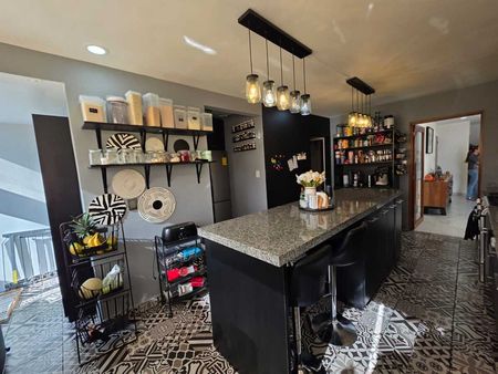 Cocina integral con barra de granito, lavavajillas, amplia alacena y espacio para refrigerador de dos puertas