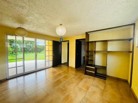Distribución: Planta baja: amplia estancia con doble altura, cocina integral, medio baño, recámara con baño, terrazas y acceso a jardín.