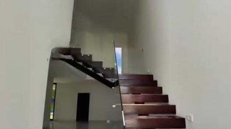 – Escalera con viga de IPR, con escalones de madera de encino con barandal de vidrio