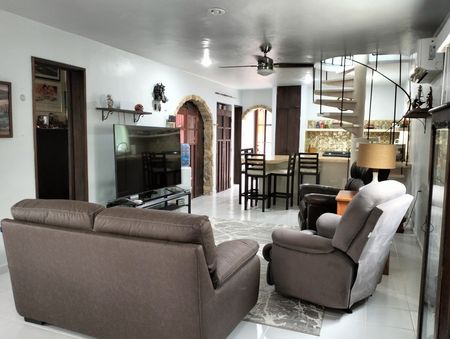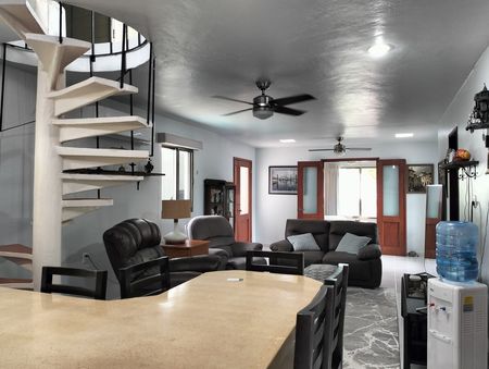 Covered garage for 2 cars that also serves as a social area connected to the pool and rear social area.