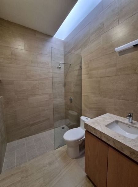 -Pisos formato 60 x 60, muro de piedra chapa de la región, altura de techos de 3 metros.