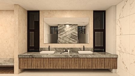 Baños con mesetas de mármol, muebles de madera bajo lavabos, espejos incluidos, canceles de cristal templado