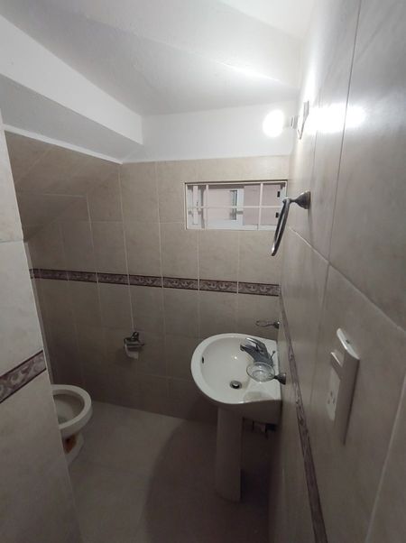 Exterior: Cochera techada para un auto y un amplio patio trasero de aproximadamente 32 m².