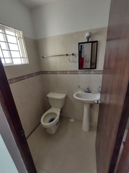 Planta Baja: Sala-comedor con aire acondicionado, cocina abierta con barra, área de lavado y medio baño para visitas.