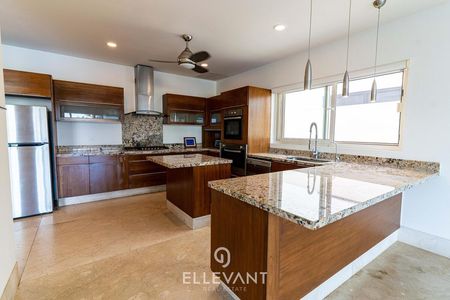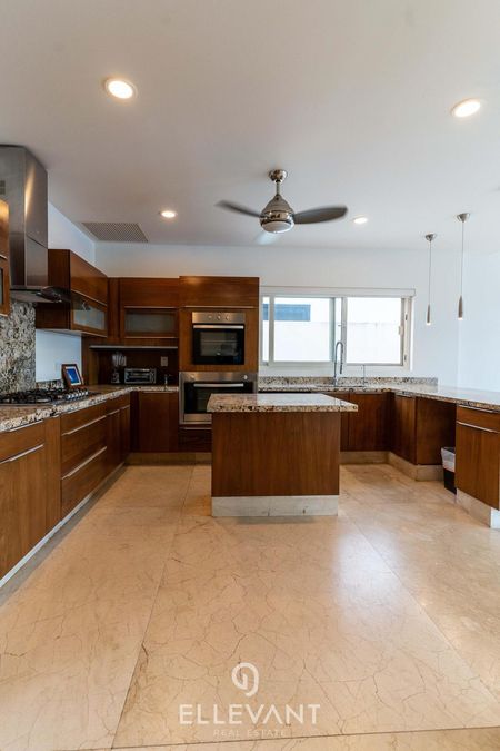 - Cocina integral con isla y meseta con barra desayunadora de granito.