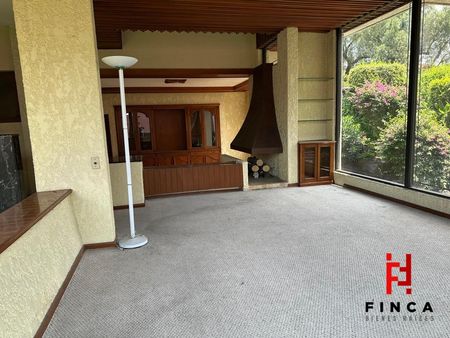 CASA DE ESTILO CONSERVADOR, EN DESNIVELES. CON 2 JARDINES, UNO DE ELLOS PLANO, DE APROX. DE 400 M2. A NIVEL CALLE TENEMOS RECIBIDOR, BAÑO DE VISITAS. COCINA, DESPENSA Y ANTECOMEDOR CON SALIDA A UNA TERRAZA Y JARDÍN TRASERO, EN DONDE TENEMOS UNA PEQUEÑO LAGO Y TERRAZA CON ASADOR. BAJANDO MEDIO NIVEL ESTÁ LA SALA DE DOBLE ALTURA, CHIMENEA DECORATIVA Y VISTA AL JARDÍN.