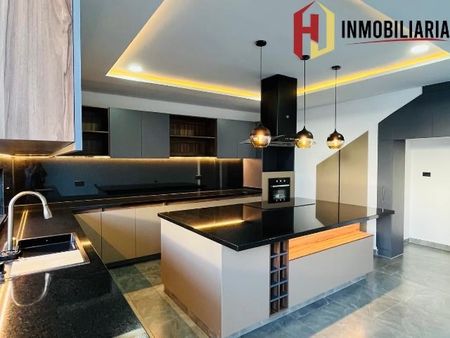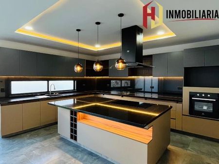 - Cocina equipada con isla con cubierta de granito, parrilla eléctrica, campana, torre de hornos y tarja moderna