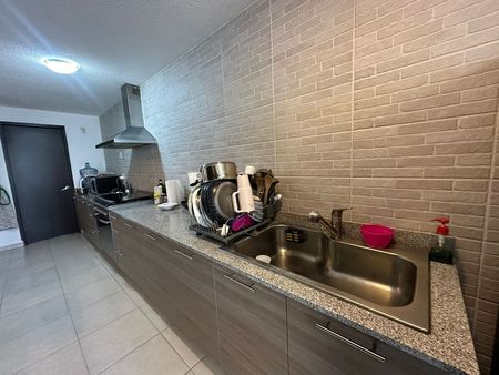 La cocina integral equipada con estufa, campana y doble tarja, con gran espacio de almacenamiento y barra desayunadora.
