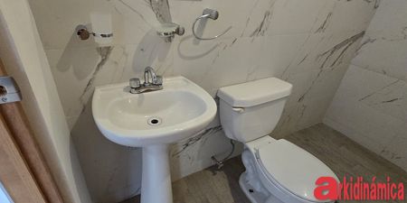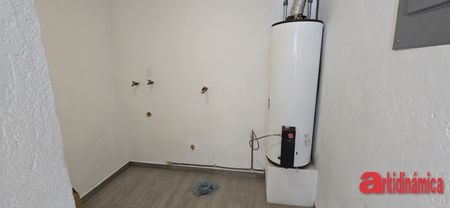 Al ingresar por la parte derecha de la propiedad, lo primero que encontramos son las escaleras que conducen al segundo y tercer nivel. Sin embargo, antes de subir, accedemos a la planta baja, donde a la izquierda se ubica el cuarto de lavado, equipado con el espacio para lavadoras y el tanque de gas. Justo al lado, un medio baño brinda funcionalidad en esta planta.
