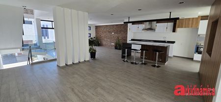 Subiendo al primer nivel, nos recibe un amplio espacio abierto que abarca toda la planta: sala, comedor y cocina se integran en un solo ambiente de diseño moderno y excelente distribución. La cocina, de estilo abierto, cuenta con una barra central elegante, mueble alacena con múltiples divisiones, y acabados de alta calidad. El área de sala, orientada hacia la calle, resalta por su amplitud y por un pilar decorativo que aporta un toque arquitectónico contemporáneo.