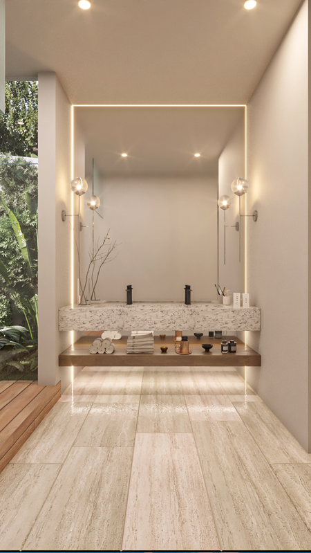 equipada con mobiliario; gimnasio con máquinas cardiovasculares, máquinas de fuerza, área de pesas y de ejercicio funcional así como salón de usos varios; todo esto rodeado de varias fuentes interactivas, árboles y predominante
