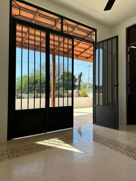 - Puertas y ventanas de acceso principal en cedro con herrería de forja.