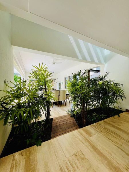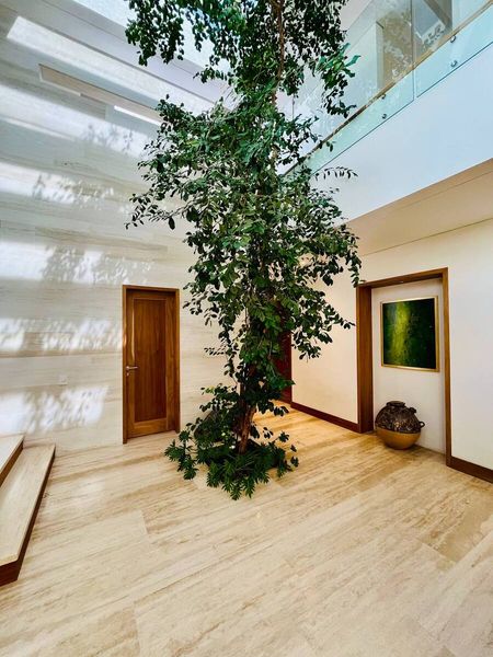 pisos de mármol, madera sólida, muros en cantera natural, soclos, puertas y clósets en madera, y ventanas de aluminio premium con mosquiteros enrollables. Al ingresar, un elegante estanque de peces koi y un árbol guayabo japonés enmarcan un recibidor de doble altura, marcando el carácter artesanal de esta casa.
