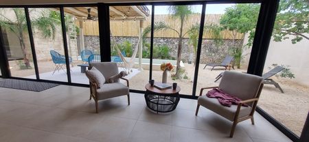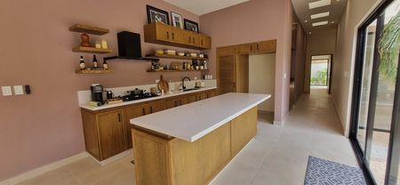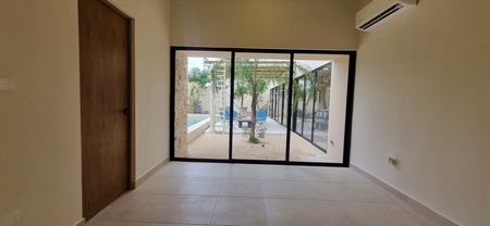 Cochera para 2 autos si techar, 3 recamaras con baño propio y medio baño de visitas espacio para closet, una recamara con vista a la terraza, Pergola en la entrada, sala, comedor y cocina open plan, closet de blancos, otra pergola en la terraza, alberca canal de nado 2 x 7.5 mt de largo, área de lavado con