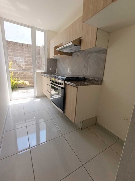 Planta baja: Cochera para un auto, sala-comedor, recámara, medio baño, cocina integral con estufa y campana, área de lavado y cisterna de 2,500 l.